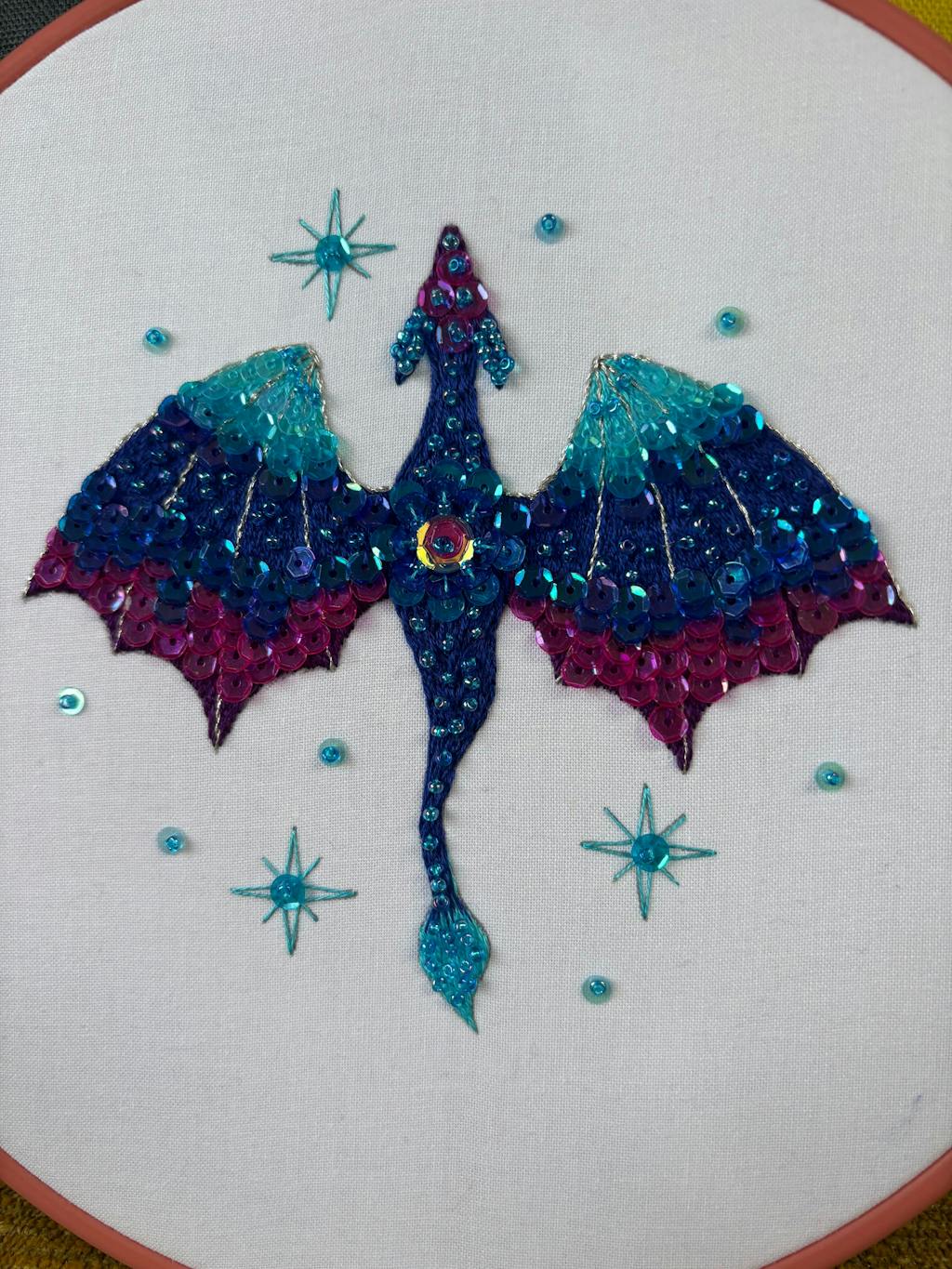 Stitch this magical, sparkling dragon and you'll have a stunning piece of Dragon Decor for your home. Easy stitching provides the foundation for layers of gorgeous specialty sequins and beads. The instructions will teach you how to do all of this!